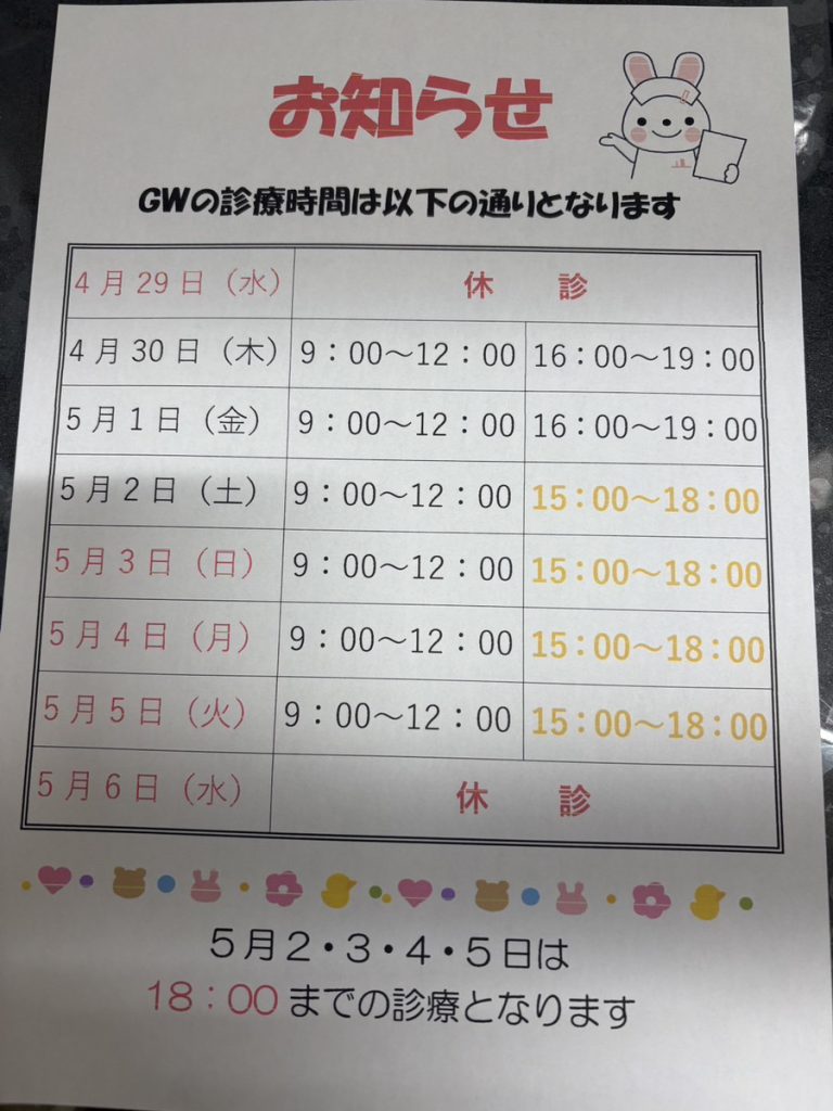 ゴールデンウィークの診療時間のお知らせ